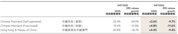 加盟店数量的萎缩,使周大福短期业绩承压。2026财年半年报显示,受门店整合影响,其内地批发业务(指向加盟商销售货品及向加盟商提供服务的收入)营业额下跌10.2%,导致公司内地营业额亦同比下跌2.5%。
