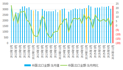 出口展现较强韧性。海关总署披露,11月中国出口(以美元计价)同比增长5.9%,较10月的-1.1%大幅反弹。11月出口呈现四个特点:一是月度出口规模创下年内单月最高水平。今年初以来,中国单月(除2月外)出口规模稳定保持在3000亿美元以上,尤其是随着中美“对等关税”谈判持续推进并达成阶段性成果,下半年单月(除10月外)几乎都保持在3200亿美元以上。11月中国出口更是创下了3303.5亿美元的年内最高纪录。从近三年同比来看,也显著高于2022-2024年11月的出口规模2096.15亿美元、2926.29亿美元和3118.77亿美元。10月的3053.5亿美元虽小幅回落,但仍处于合理区间。当月出口增速下滑,部分归因于去年同期基数较高。二是中国对美出口趋于稳定。11月对美出口规模为337.9亿美元,略低于9月、10月的343亿美元、349.2亿美元,表明随着近期中美贸易关系谈判后趋向缓和,中国对美出口在经历前期的波动后已渐趋稳定。三是对东盟、欧盟等市场出口增长保持较快增速。11月中国对东盟、欧盟出口增速分别为8.17%、14.83%,对冲了对美出口下滑的近八成规模。此外,11月中国对拉美、非洲、英国、澳大利亚、印度等国家和地区的出口均保持较快增长。四是机电产品和高新技术产品继续扮演中国出口“压舱石”的角色。11月机电产品出口规模为2058.97亿美元,同比增长9.65%,在全部中国商品出口金额中的比重高达62.3%,是当之无愧的“压舱石”。此外,按高新技术产品口径归类,11月出口规模超过880.7亿美元,同比增长7.68%,占比为26.7%。这些占比越来越高的中高端制造业出口实现稳定增长,是中国出口保持较快增速的重要因素。