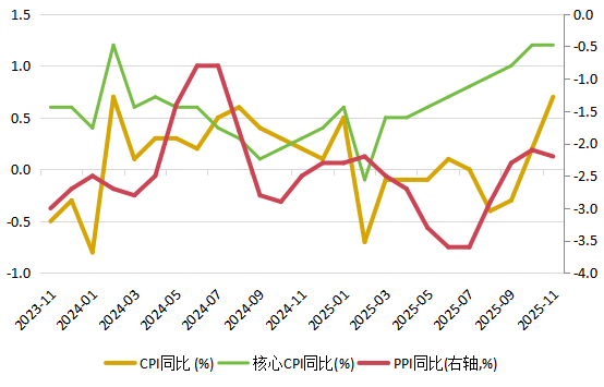 社融保持较好增长,其中企业融资表现亮眼;物价总体维持上涨趋势。11月新增信贷3900亿元,同比少增1900亿元;信贷余额同比增长6.4%,较上月回落0.1个百分点。社融增量2.49万亿元,同比多增1597亿元;社融存量同比增长8.5%,与上月持平。11月M2同比8.0%,较上月下降0.2个百分点;M1同比回落1.3个百分点至4.9%;M2-M1增速剪刀差由上月的2个百分点扩大至3.1个百分点。11月信贷增量较少,其中仍然呈现信贷减少与社融增加的替代现象,社融仍然维持较高增速,且政府债券保持较好发行节奏。居民信贷需求再度下降,有季节性因素的影响,也有消费能力与意愿不强的影响。外部需求推升出口、政府投资推升配套融资,11月企业信贷需求恢复较好,债券发行也在同步提速。11月CPI同比由上月的0.2%大幅回升至0.7%,核心CPI同比与上月1.2%相同,连续多月维持上涨趋势;PPI同比降幅小幅回落0.1个百分点,至-2.2%。整体来看,当前物价指数保持回升趋势,需求呈现稳步修复态势。