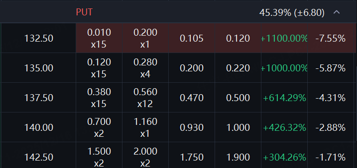 阿里巴巴认沽合约价格大涨,两张PUT的价格涨幅分别达到1000%、1100%。
