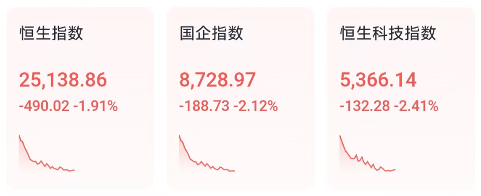 12月16日周二,港股三大指数上午全线走低。截至午间收盘,恒生科技指数大跌2.41%,国企指数跌2.12%,二者均刷新近期阶段低位,恒生指数跌1.91%。
