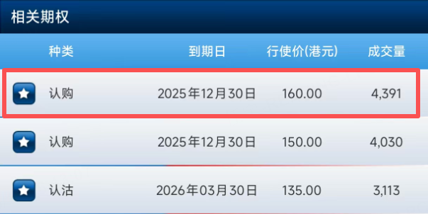 期权方面,阿里巴巴一张12月30日到期,行权价160港元的认购合约排在成交榜第一位,较现价有超过10%的涨幅空间。