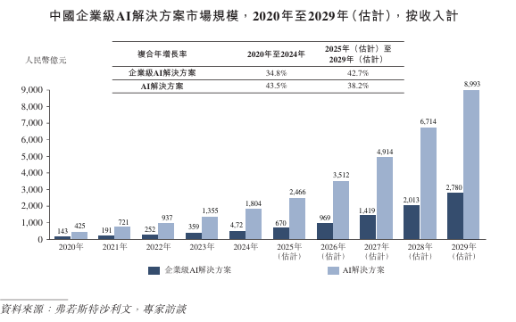 中国AI解决方案市场规模持续扩张,企业级AI解决方案市场规模从2020年的143亿元增长至2024年的472亿元,期间实现了34.8%的复合年均增长率。在企业数字化转型和政府智能化建设加速的带动下,预计2025年至2029年将以42.7%的复合年增长率增长,到2029年达到2,780亿元。