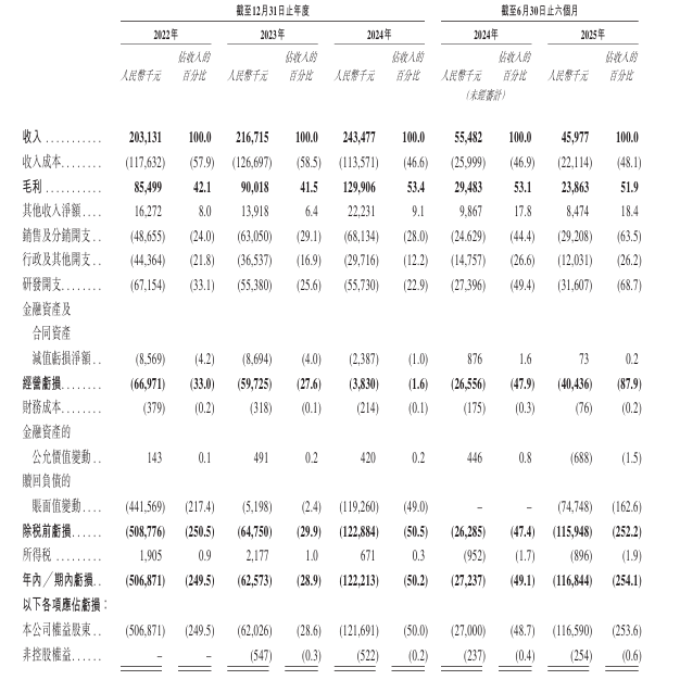 不过,公司尚未摆脱持续亏损的经营现状,盈利拐点尚未显现。2022-2024年公司累计净亏损达6.92亿元,2024年净亏损同比扩大95.3%至1.22亿元,2025年上半年亏损进一步飙升至1.17亿元,已接近2024年全年水平,净亏损率高达254.1%。目前,招股书亦未披露明确的盈利时间表。