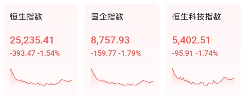 12月16日周二,港股三大指数集体收跌。恒生指数收报 25235.41 点,跌 1.54%;恒生科技指数收报 5402.51 点,跌 1.74%;国企指数收报 8757.93 点,跌 1.79%。