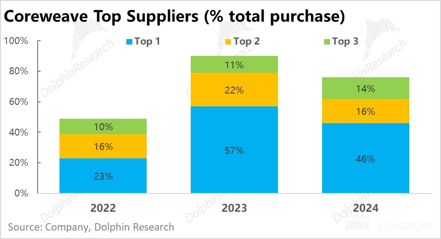 从上文来看,部分出于 AI 时代的时代性特征,部分是由于 CoreWeave 自身在客户结构和技术能力上的 “缺陷”,CoreWeave 在需求整合能力上,属于走量型,质量一般。那么供应链整合能力上,CoreWeave 的 “实力” 又如何?