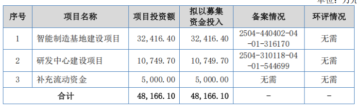 锐翔智能此次IPO拟募资4.82亿元,分别投向智能制造基地建设项目、研发中心建设项目以及补充流动资金,拟投入募资额分别为3.24亿元、1.07亿元、5000万元,上述项目总投资全部依赖于募集资金。