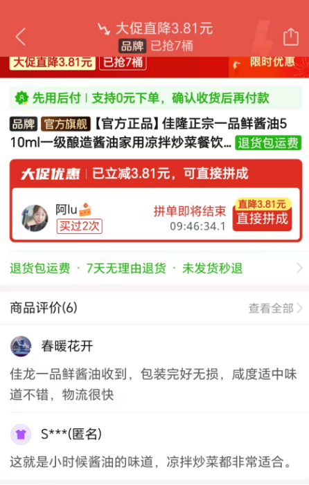 不过截至12月15日,相比于公司旗下一款鸡粉产品超万次评价,其酱油产品的商品评价不足10次。