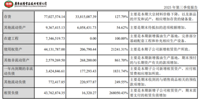 三季报显示,公司为拓展酱油新业务进行了密集投入,但这一战略转型在短期内加重了其财务负担。其存货金额同比增长127.79%至7702.76万元,公司称,主要系本期大宗材料价格下降,以及新品的开发和试产,相应增加存货的储备量。此外为快速实现产能,公司选择直接租赁厂房与设备,导致租赁负债与一年内到期的非流动负债分别同比激增268050.43%和1831.74%。
