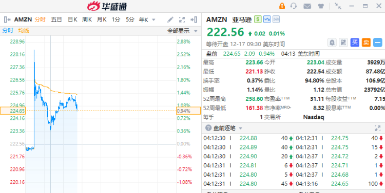 华盛资讯12月17日讯,美股三大期指盘前小幅走高,亚马逊涨超1%,OpenAI据悉洽谈从亚马逊融资100亿美元。