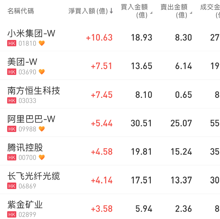 小米集团-W、美团-W、南方恒生科技分别获净买入10.63亿港元、7.51亿港元、7.45亿港元;