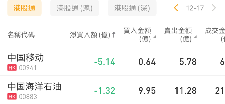中国移动、中国海洋石油遭净卖出5.14亿港元、1.32亿港元。