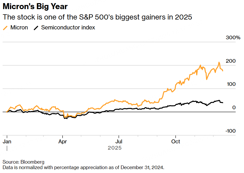 美光科技的股价在2025年上涨了176%,在标普500指数中表现排名第五,远超费城证券交易所半导体指数40%的涨幅,有望创下自2013年以来的最佳年度表现。但自12月10日触及高点以来,该股一直在回落,过去四天下跌了12%。这家芯片制造商将在收盘后发布财报,财报可能会提振股价,也可能导致跌势加剧。