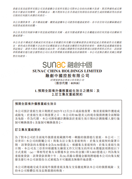 融创中国在港交所公告,公司预计重组生效日期将于2025年12月23日或前后落实,惟须重组条件获达成或豁免。于重组生效日期落实之日,公司约96亿美元的现有债务将获全面解除及免除,作为代价,公司将根据计划条款于重组生效日期向计划债权人发行强制可转换债券1及强制可转换债券2。