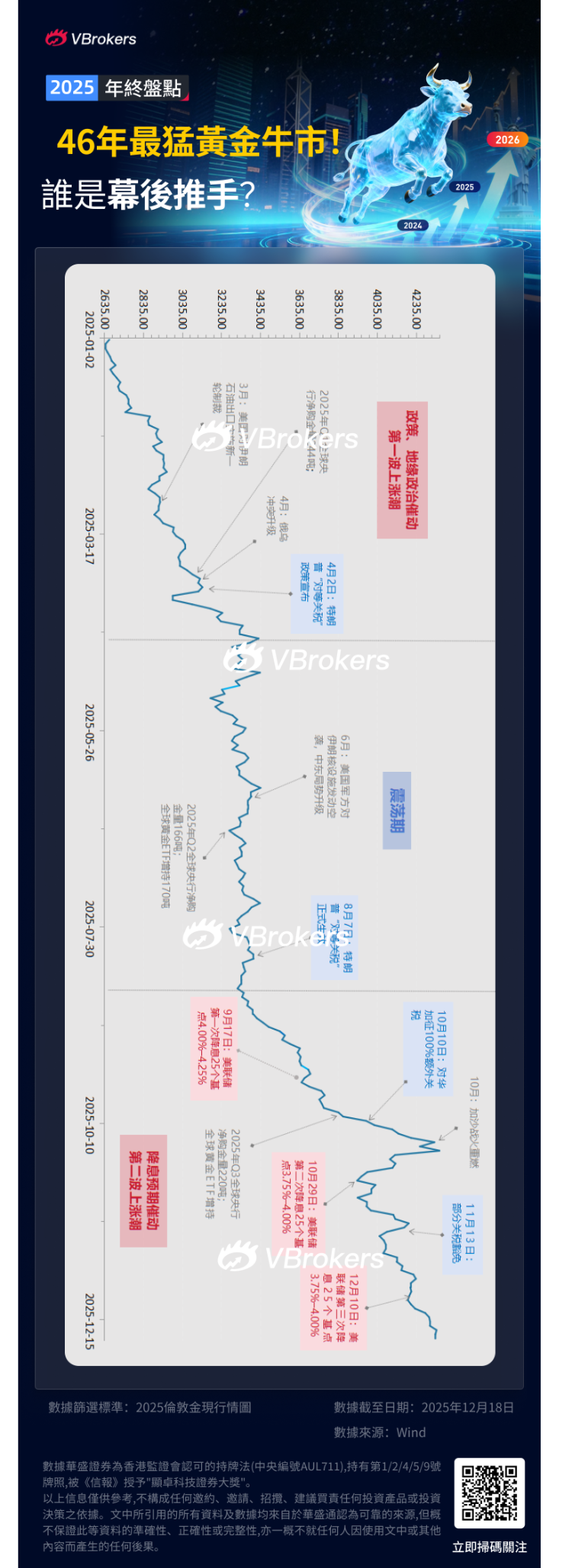2025年,美联储在9月、10月和12月连续三次降息,累计下调利率75个基点。降息直接压低了持有黄金(不生息资产)的“机会成本”。特别是在9月首次降息落地后,金价应声大涨18%,直接冲上10月末的历史新高。