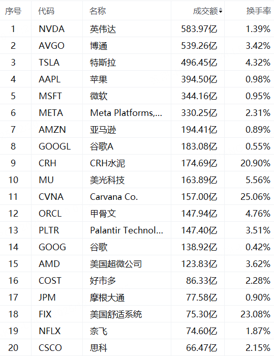 周五美股成交额第1名 英伟达 收高3.93%,成交583.97亿美元。