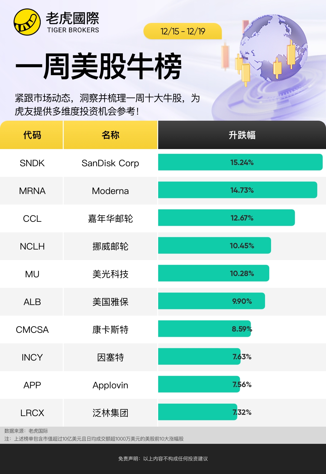 上周哪些股票表现优异?以下是截至12月19日当周,标普500指数成分股涨幅前十名: