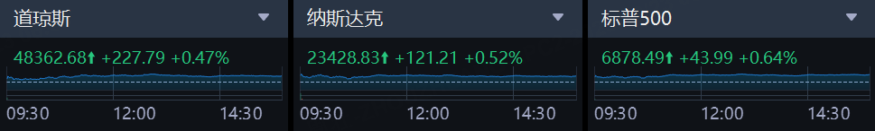周一,美股高开高收,三大指数均连涨三日。截至收盘,道琼斯指数涨0.47%,报48362.68点;标普500指数涨0.64%,报6878.49点;纳斯达克综合指数涨0.52%,报23428.83点。