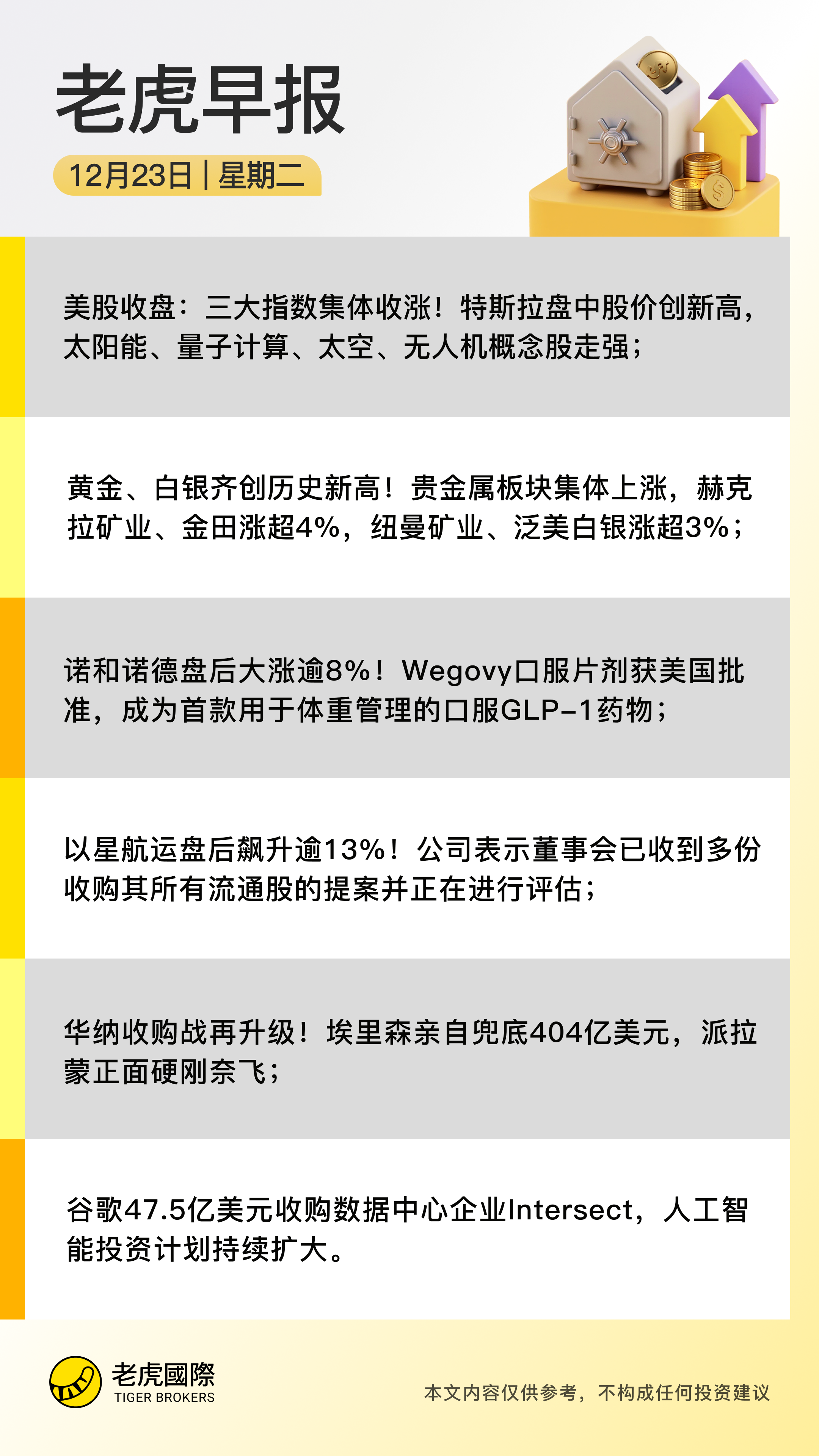美股收盘:三大指数集体收涨!特斯拉盘中股价创新高,贵金属、太阳能、量子计算、太空、无人机概念股集体走强