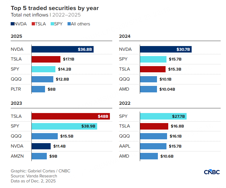 Vanda 的数据显示,Palantir有望成为今年净买入金额排名第五的证券,仅次于特斯拉、英伟达等超大型股,以及追踪美国整体市场的 标普500ETF(SPY)等热门 ETF。