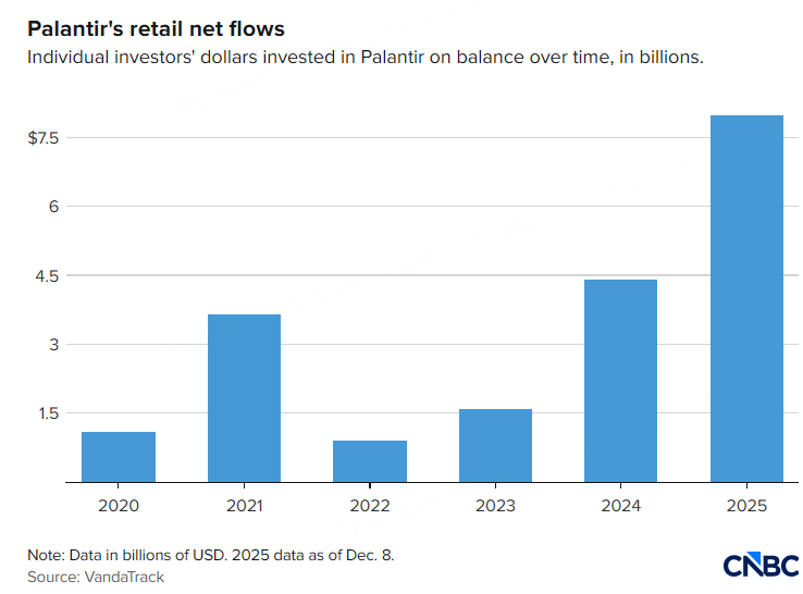截至 12 月 8 日的数据,2025 年散户净买入Palantir股票的金额接近 80 亿美元,同比增加超过 80%,较 2023 年增长超过 400%。