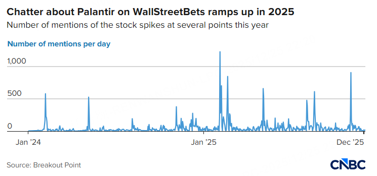 该股在 Reddit 的 WallStreetBets 论坛上也是热门话题。Breakout Point 数据显示,2025 年多天内它是提及次数最多的股票。