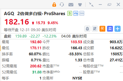华盛资讯12月31日讯,美股白银ETF盘前集体走弱,2倍做多白银ETF $AGQ 重挫逾12%,白银ETF $SLV 跌近6%;消息面上,芝商所再次提高交易保证金,贵金属集体重挫。