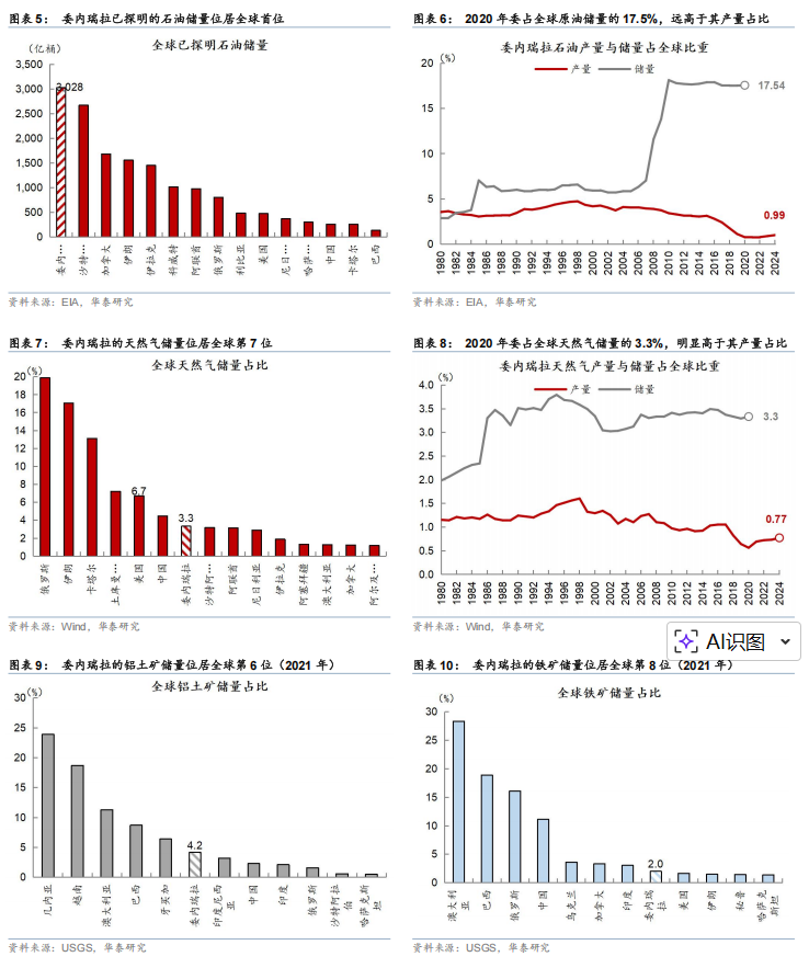 特朗普明确表态,美国将对委内瑞拉实施“管理”直至完成所谓“安全”过渡,并将“深度参与”委内瑞拉此前以国有运营为主的石油产业。这一言论引发全球能源市场高度警惕,毕竟委内瑞拉自然资源丰厚,涵盖石油、天然气、铁矿、铝矾土、黄金、煤、镍、金刚石等多个品类。其中石油领域呈现典型的“高储量、低产量”特征,据华泰证券统计,2020年其石油储量占全球17.54%,居世界首位,但产量却仅不足1%;天然气储量则位居全球第七位。