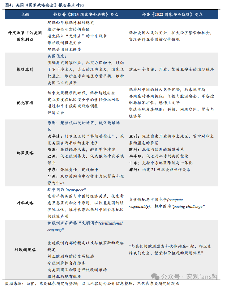 “门罗主义”的升级版本——核心地区寻求绝对主导,非核心地区寻求性价比的“唐罗主义”。在特朗普对委内瑞拉的特别军事行动打破了市场对美国外交的“固有思维”后,我们认为应关注本届特朗普政府的外交政策范式的三个特征:①美国优先。相较于拜登政府注重意识形态输出,在外交上强调“以民主对抗权威(A Battle between Democracy and Autocracy)”的叙事逻辑,特朗普则更关注美国自身利益。“美国优先”这一理念也始终贯穿本届特朗普政府的内政外交。具体来讲,特朗普认为应放弃与美国利益毫无关联的全球负担,将更多战略资源投入西半球等核心区域。②以实力求和平。如NSS报告中所述,特朗普认为美国必须拥有足够强大的军事能力和经济实力,才能有效阻止潜在敌对势力的威胁,并在对方尊重实力的前提下帮助推进和平与冲突解决。这也是其选择通过武力打击“斩首”委内瑞拉总统,保障美国在西半球的战略主导地位的原因。③灵活的现实主义。即便追求绝对的军事、经济与技术实力优势,特朗普仍寻求“与世界各国建立良好关系和和平的商业关系”,认为在处理外交问题上应采取“灵活姿态”。例如,在面对俄乌、中东等非核心地区地缘冲突时,特朗普倾向以高性价比的和平谈判形式介入,但在谈判进展受挫时转用极限施压的方式推动政策进程。而在面对美洲等核心区域时,特朗普则选择军事打击,以“雷霆之势”迅速解决委内瑞拉问题,确保美国战略主导地位的绝对稳固。综合来看,特朗普政府的外交政策范式并非单纯门罗主义的复刻,而是以此为基础的升级版:于核心地区(西半球)寻求绝对主导,非核心地区(欧洲、中东等)寻求“以小成本换大利益”的门罗主义2.0,即外界所谓的“唐罗主义(Donroe Doctrine)”。