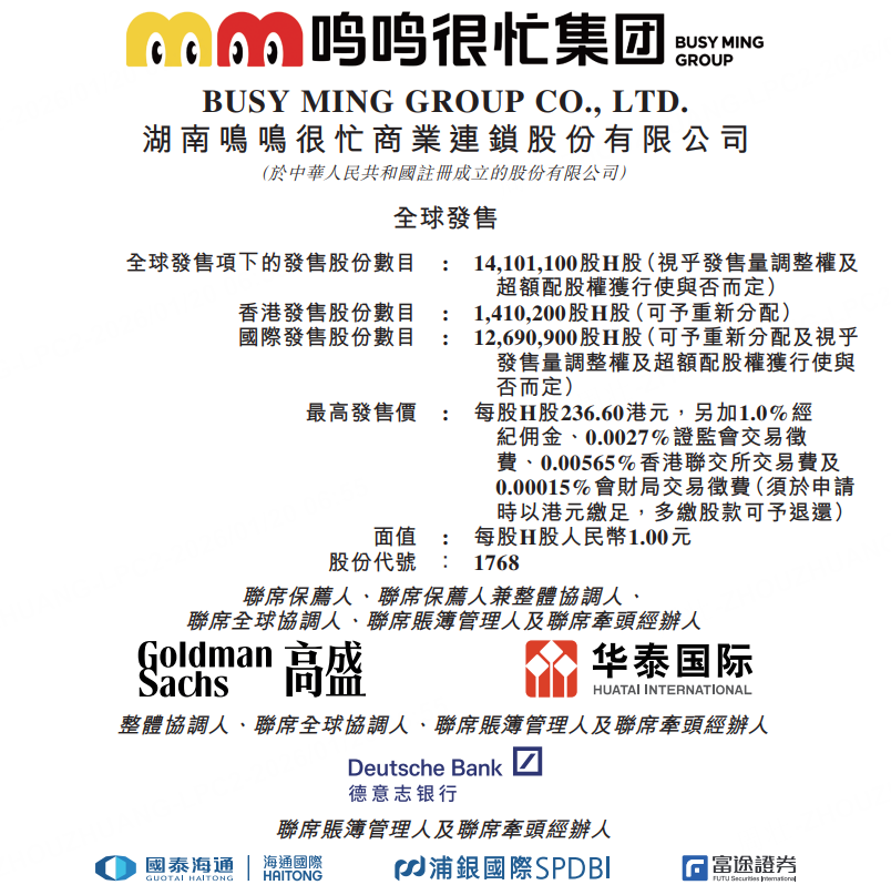1月20日,鸣鸣很忙发布公告,于1月20日至1月23日招股,公司拟全球发售1410.11万股,每股发售价229.60港元-236.60港元,每手100股,入场费23898.62港元,预计将于2026年1月28日开始在港交所挂牌交易。