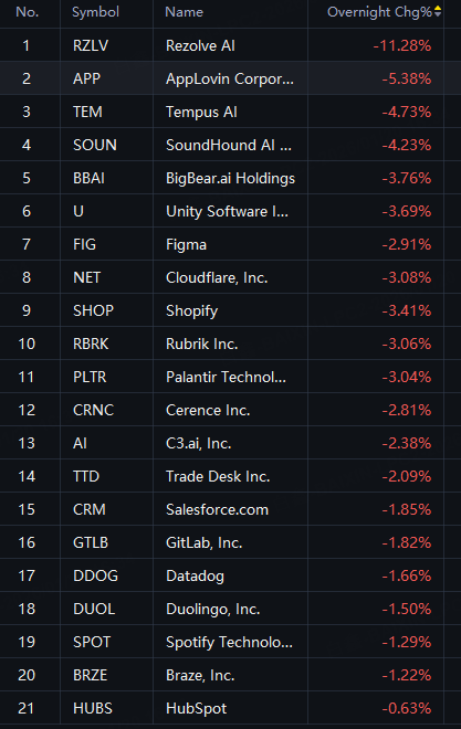 1月20日,美股夜盘时段,AI应用概念股集体下跌。Rezolve AI跌超11%,AppLovin Corporation跌超5%,Tempus AI、SoundHound AI跌超4%,BigBear.ai Holdings、Unity Software、Figma、Cloudflare、Shopify、Rubrik Inc、Palantir 跌超3%,Cerence Inc、C3.ai、Trade Desk跌超2%。