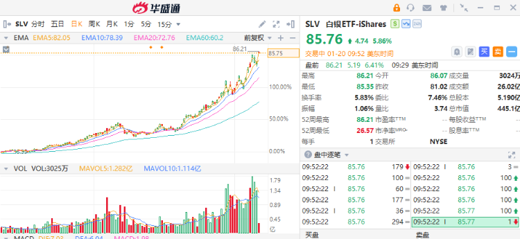 华盛资讯1月20日讯,格陵兰岛危机引发贸易战担忧!金银价格集体创新高,黄金ETF $GLD 涨超3.4%,白银ETF $SLV 涨近6%。