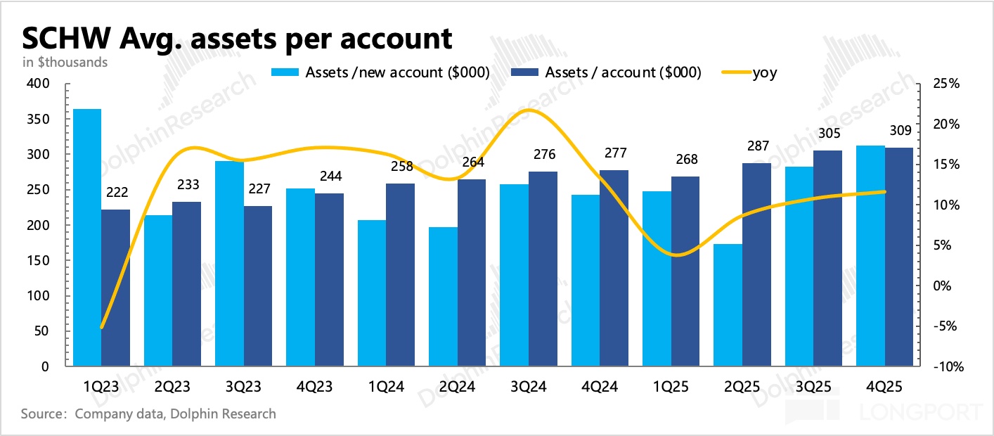 (2)四季度客户资产总规模接近 12 万亿美元,人均账户资产规模进一步增长到 31 万美元。整体来看,当季新增的 3000 多亿资产,只要来自新增入金 1640 亿(另有一次性转出 60 亿),以及本身资产增值 1510 亿。