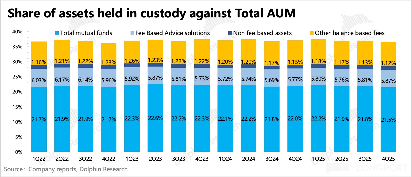 4、财富管理业务:在基数走高下收入反而增长加速达到 15%,但费率依旧稳定小幅下滑,因此主要靠嘉信整个平台生态的资产规模拉动。