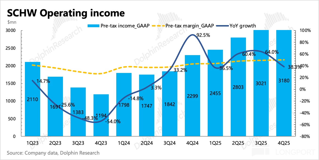 $嘉信理财(SCHW.US) 四季度业绩画风依旧很稳,整体财务表现符合预期,收入稍 miss(预期差主要在 BDA 账户收费上),但因为费用控制得比较好,利润 beat 了回来。值得一提的是,海豚君主要关注的核心运营指标则表现不错,均超市场预期,反映嘉信稳定的内生增长动能。