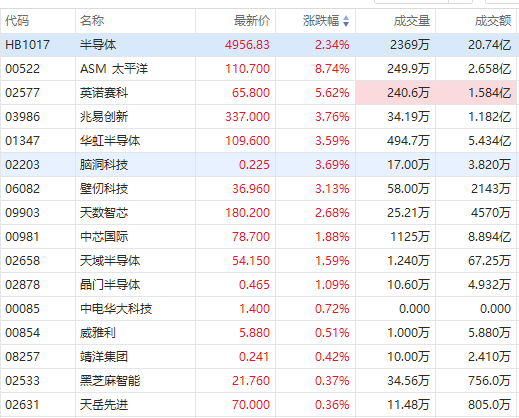 英诺赛科涨超5%、华虹半导体、壁仞科技涨超3%,天数智芯、中芯国际涨约2%。