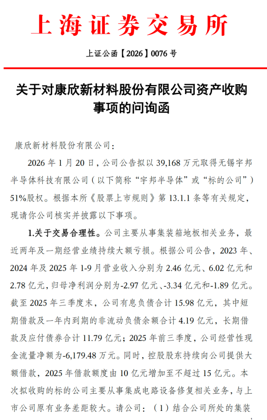 康欣新材此次高溢价、“跨界”并购交易,不仅受到市场的高度关注,也引发了监管机构的重点问询。上交所针对该交易迅速下发问询函,要求公司进一步核实并披露相关细节。