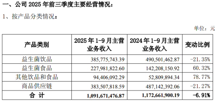 该业务收入从2020年的7.7亿元缩减至2023年的5.8亿元,各年同比降幅依次达35.16%、2.09%、13.65%和10.88%。至2024年,公司在财报中将其归入新设的“益生菌饮品”类别,而该品类收入仍未能扭转跌势,同比下滑2.71%。