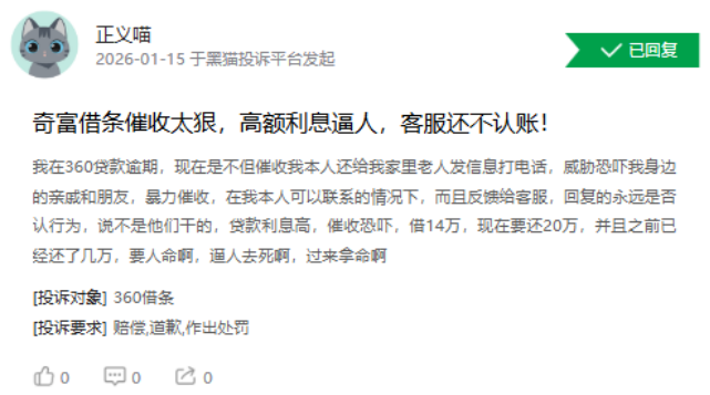 除了暴力催收,奇富借条的高息与费用争议也持续发酵。有用户指出,其实际借款成本远超名义利率,平台通过收取“服务费”“担保费”等方式变相抬高综合费率。1月15日,另有用户投诉称:“我在360贷款逾期,现在不但催我本人还给我家里老人发信息打电话,威胁恐吓我身边的亲戚和朋友,暴力催收…… 贷款利息高,催收恐吓,借14万,现在要还20万,并且之前已经还了几万...”