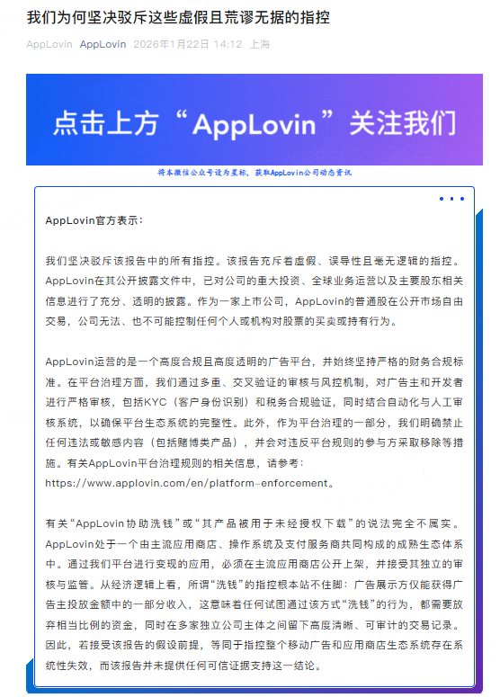 1月22日,针对此前做空机构Capitalwatch发布的做空报告,AppLovin方面回应称,坚决驳斥该报告中的所有指控。该报告充斥着虚假、误导性且毫无逻辑的指控。AppLovin在其公开披露文件中,已对公司的重大投资、全球业务运营以及主要股东相关信息进行了充分、透明的披露。作为一家上市公司,AppLovin的普通股在公开市场自由交易,公司无法、也不可能控制任何个人或机构对股票的买卖或持有行为。