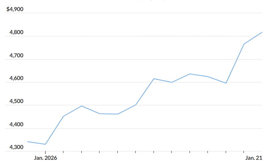 新年仅过去三周,黄金已大幅上涨,这使得市场对其能否首次触及每盎司5,000美元的问题已几乎毫无悬念。