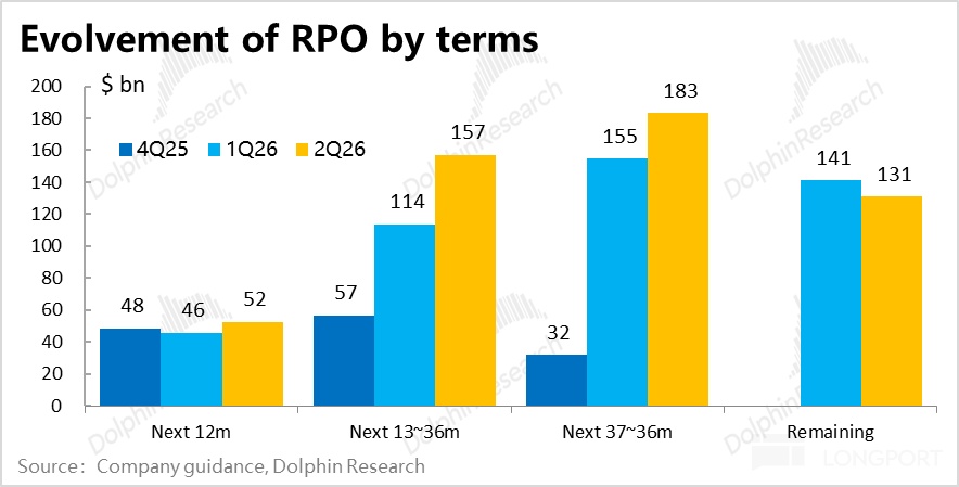 最新RPO(合同履约余额)会在后续不同时间段内确认的金额(分未来 12 个月,未来 13~24 个月等 4 段区间),大致匹配 FY26 财年,FY27~28 两年,FY29~30 两年的收入指引,可以看到: