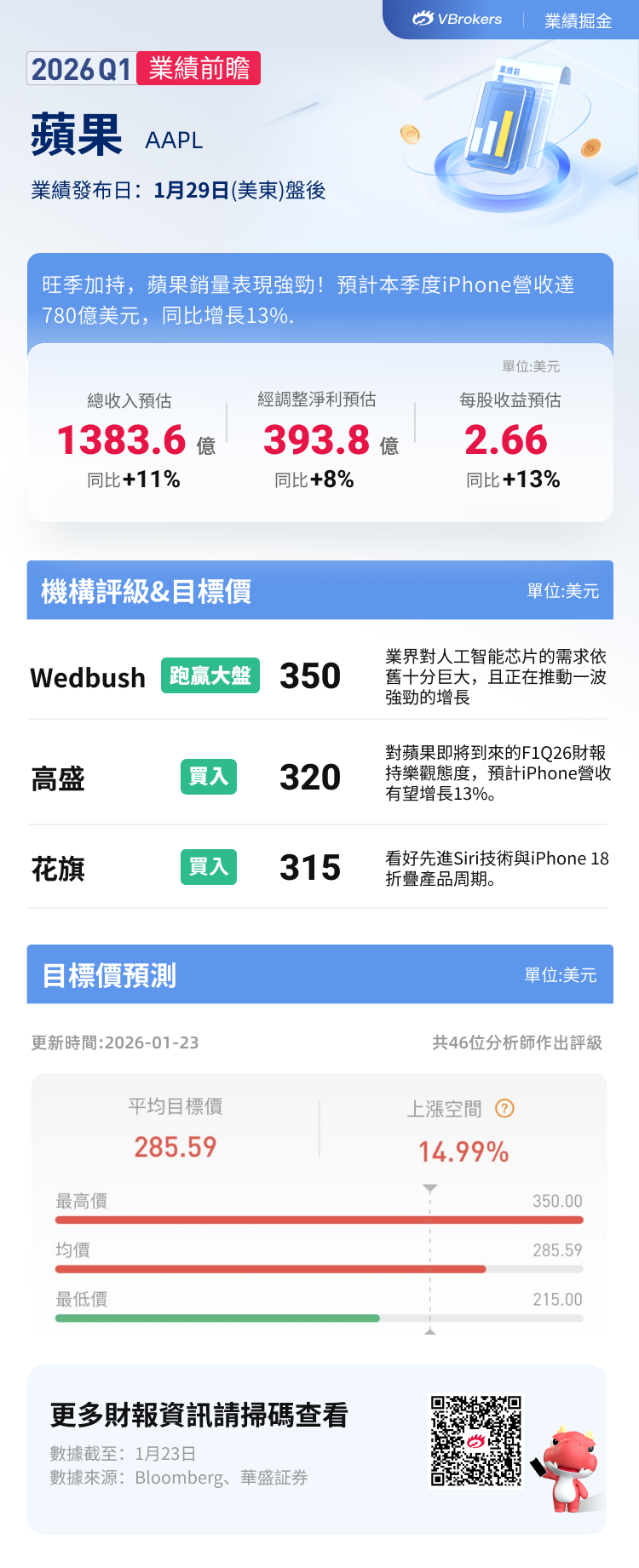 美银证券同样看好苹果业绩超预期,预计 EPS 2.69 美元、营收 1400 亿美元;上调 iPhone 出货量预估,12 月季度增至 8500 万台、3 月季度增至 5400 万台,推动 iPhone 营收同比增 17%,有望创下智能手机行业最强劲季度表现之一。