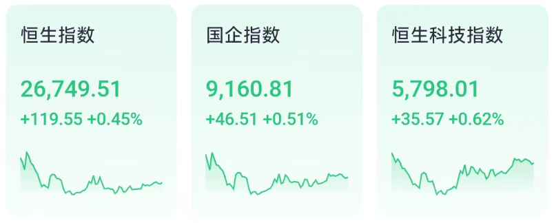 1月23日周五,港股三大指数集体收涨,本周总体仍小幅下跌。截至收盘,恒生指数涨0.45%报26749点,国企指数涨0.51%,恒生科技指数涨0.62%。