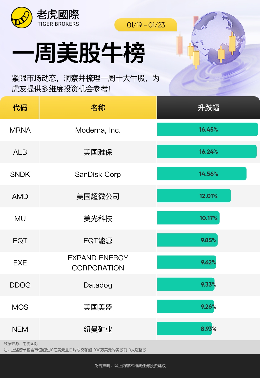 上周哪些股票表现优异?以下是截至1月23日当周,市值超过200亿美元的美国股票中涨幅前十名:
