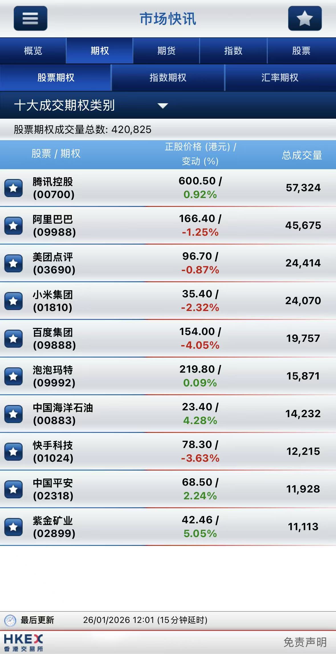 截止午间收盘,港股期权半日成交逾42万张,其中,腾讯控股成交量居首,期权成交超5.7万张;阿里巴巴-W名列次席,期权成交超4.5万张;美团-W位居第三,期权成交超2.4万张。