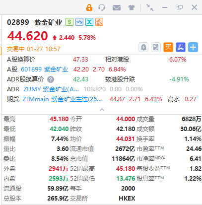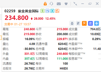 华盛资讯1月27日讯,紫金黄金国际大涨逾12%,成交额18亿港元。