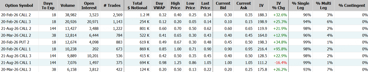 Proshares二倍做空白银ETF当日成交18.09万张,较90日均量放大逾26倍,看涨期权占比升至86.8%,其中于2月20日到期的2美元行使价的看涨期权成交居前,成交近4万张。