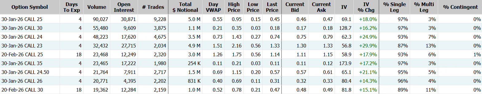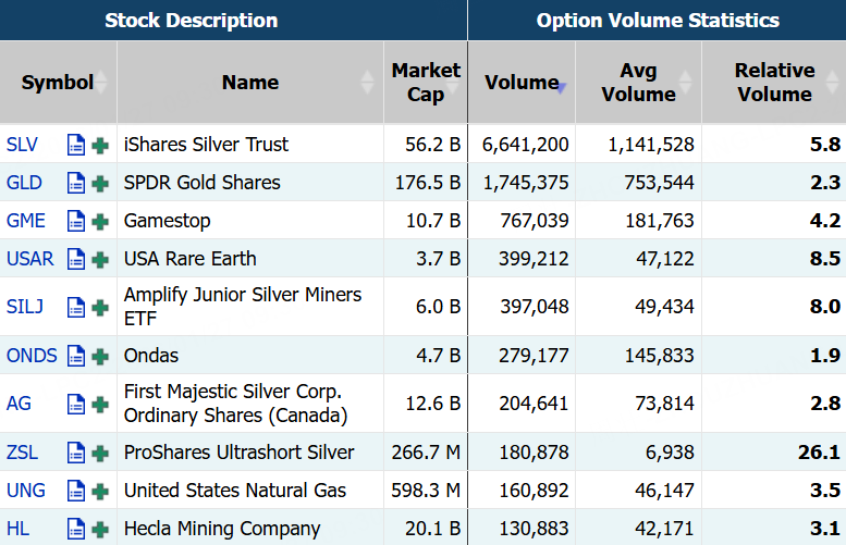 期权方面,据Market Chameleon数据显示,白银ETF-iShares当日成交664.12万张,较90日均量放大近6倍,看涨期权占比降至53.9%,其中于1月26日到期的100美元行使价的看跌期权成交居前,成交近20万张。