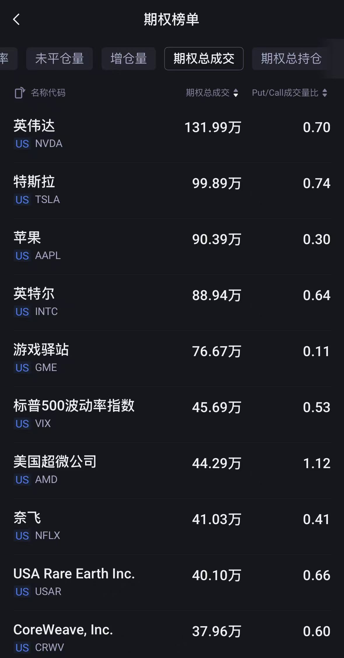 热门科技股期权成交量降温,其中,英伟达成交131.99万张、特斯拉成交99.89万张、苹果成交90.39万张、英特尔成交88.94万张;